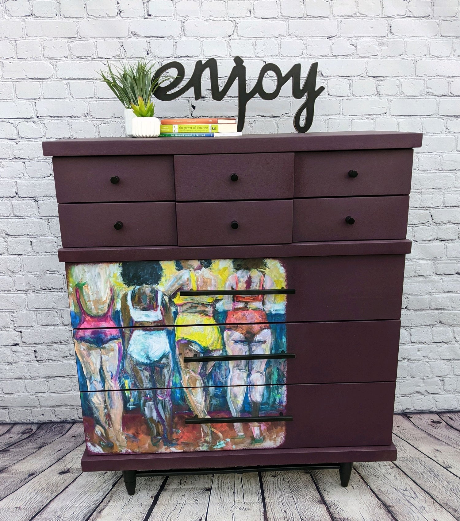 Great sassy MCM dresser painted with Wise Owl Black Cherry with a Bubblegumyum print. Purchase price is $340. This does not include shipping or delivery.