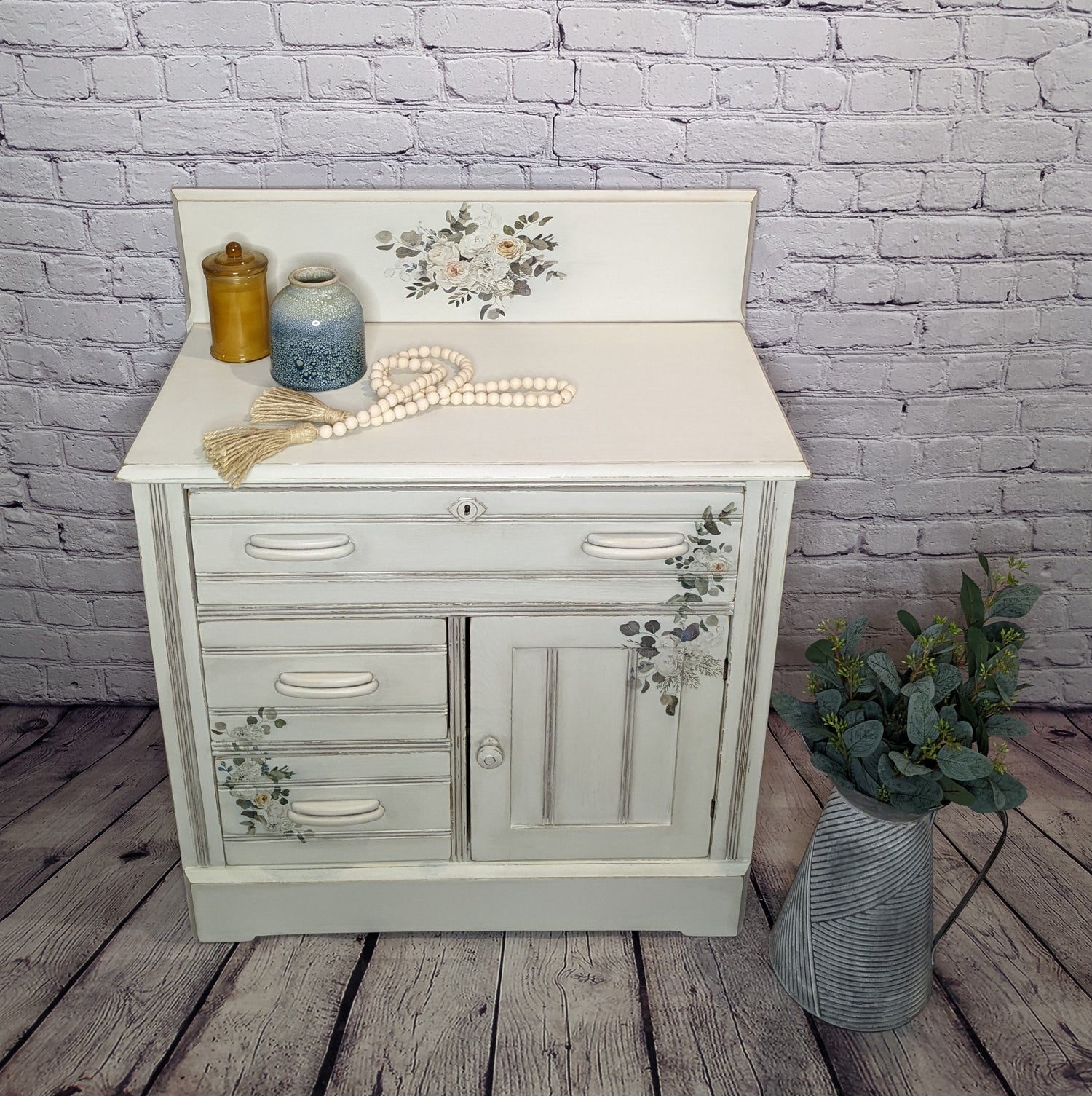 Great upcycled antique washstand, solid wood, dovetail drawers, painted with Wise Owl chalk synthesis Kashmir paint. Embellished with transfers, dark walnut wax and drawers lined with beautiful coordinating paper.